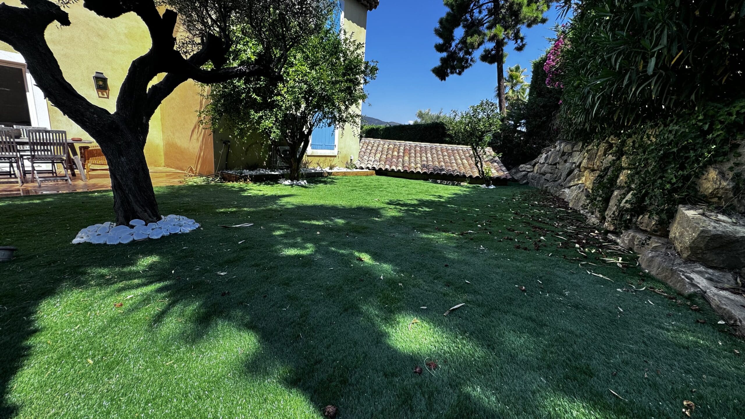 Le gazon synthétique reste impeccable en toute saison, offrant un cadre de vie agréable et un aspect toujours soigné de votre jardin.